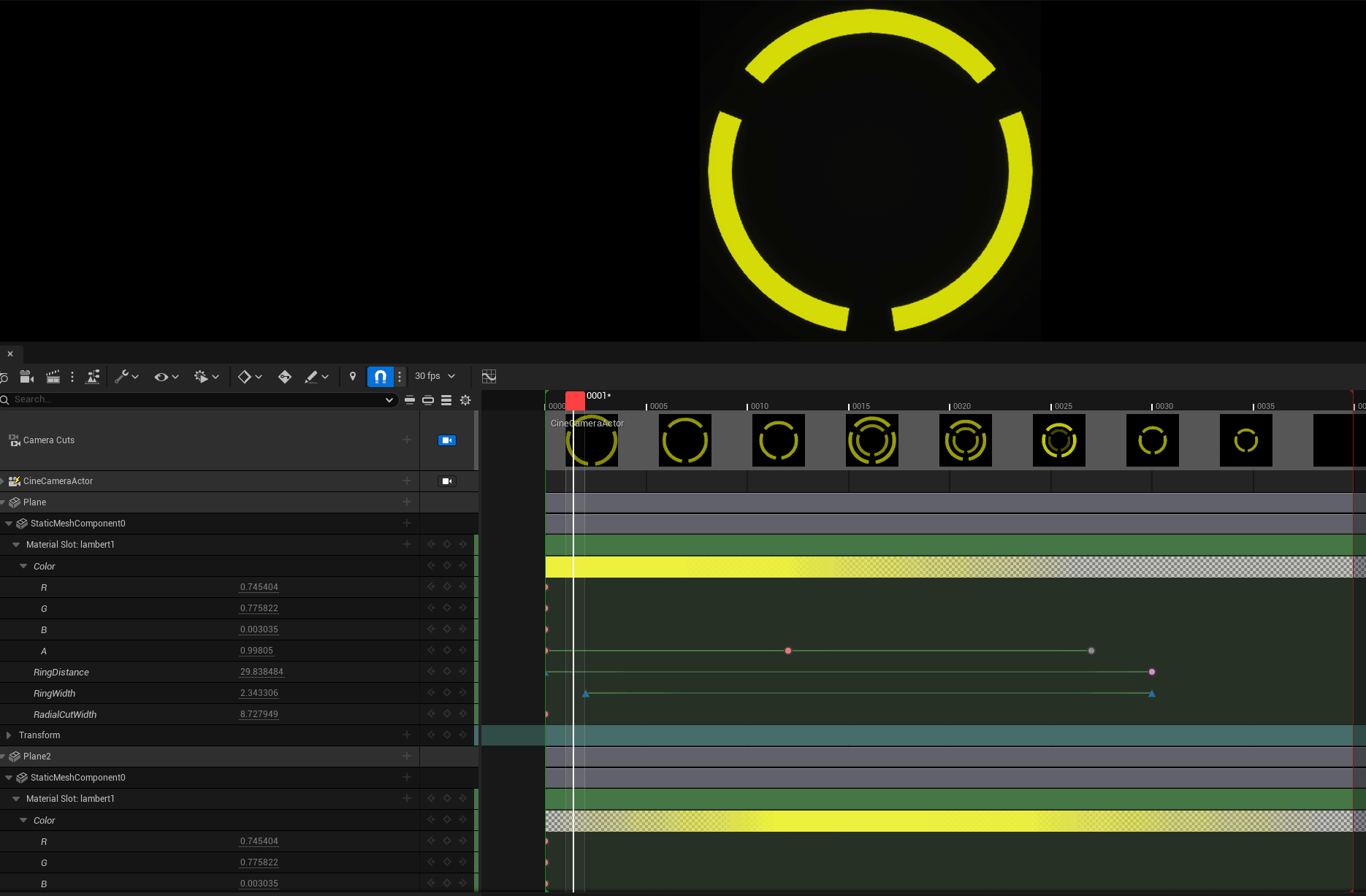 To create the animation and recording, I’m using Unreal’s Sequencer tool. Their website gives much deeper documentation, but my usage here is very simple. To set the stage for animation work, I created a new Level Sequence and added a CineCameraActor that points directly down at the graphic.